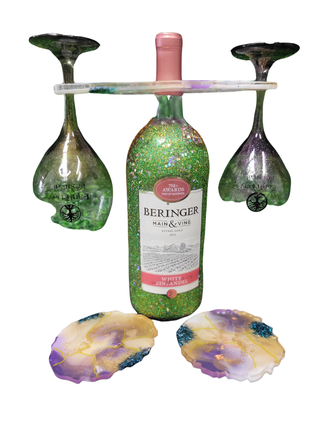 Let your Wine Glasses Hang. Come with holder and 2 matching coaters