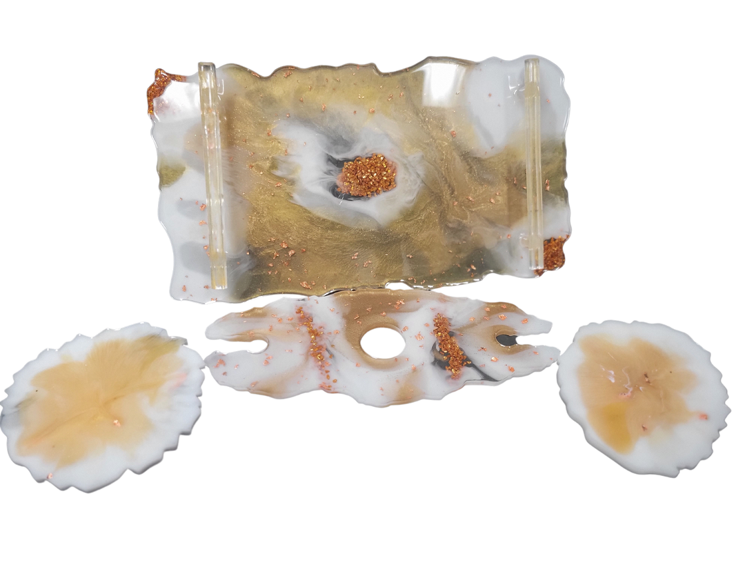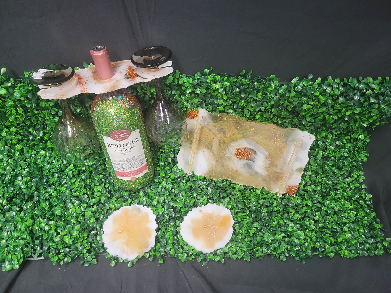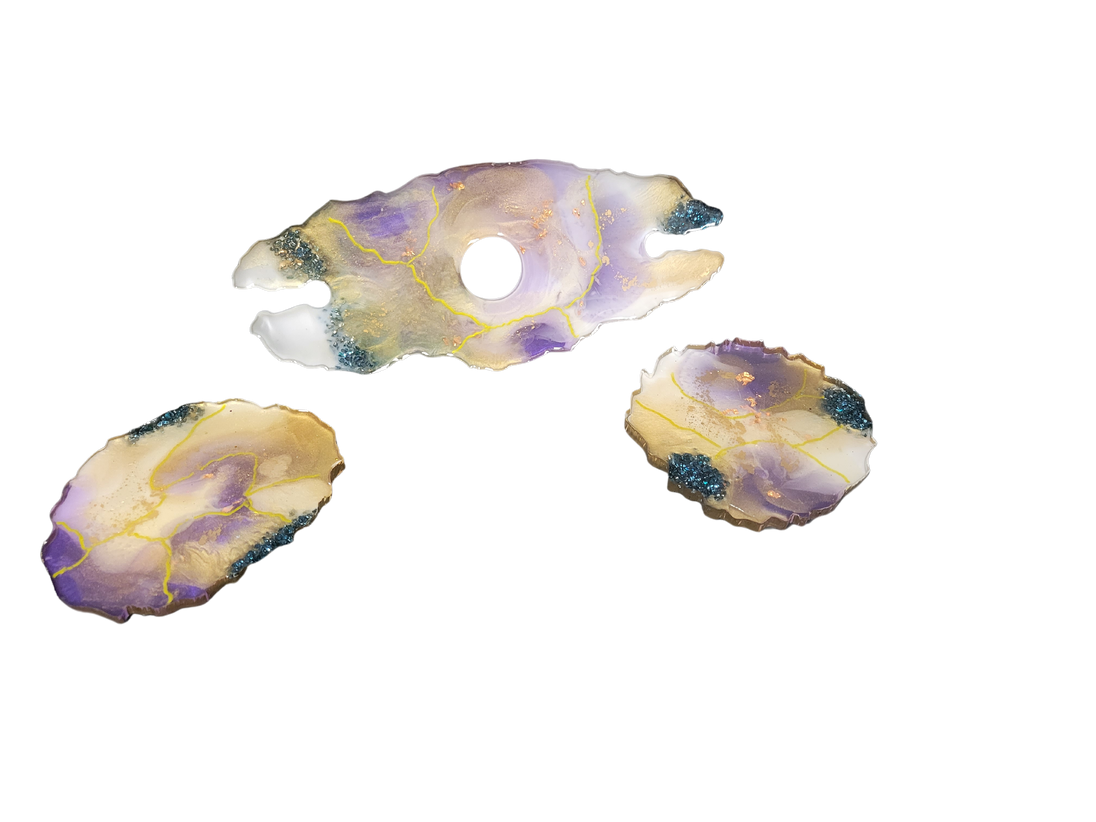 Geode tray with metal handles and Matching Wine Holder. Come with 2 matching coaters