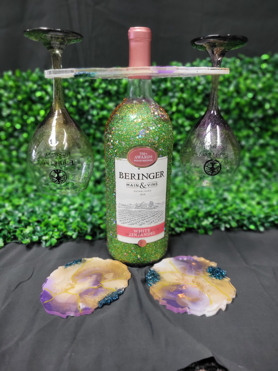 Let your Wine Glasses Hang. Come with holder and 2 matching coaters